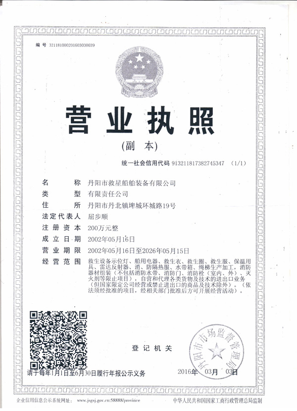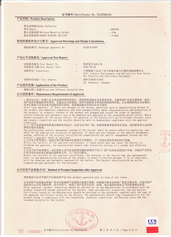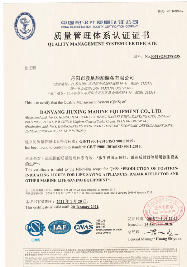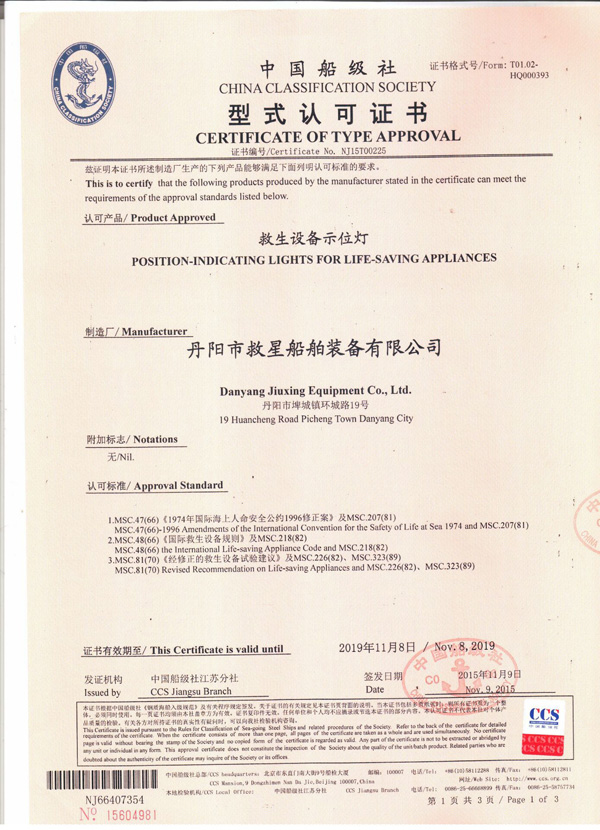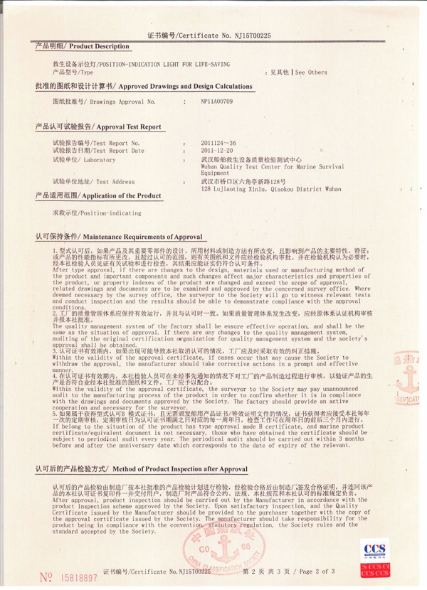 丹陽市救星船舶裝備有限公司為丹陽市船舶救生照明設(shè)備廠子公司,主要生產(chǎn)救生設(shè)備示位燈、雷達反射器、引航員軟梯、登乘梯等產(chǎn)品。其中救生設(shè)備示位燈采用國際上最先進的科學(xué)技術(shù)、生產(chǎn)工藝,優(yōu)質(zhì)材料制造,各項技術(shù)指標超過國際先進水平,完全滿足國際最新標準。2012年元月取得“CCS”型式認可證書,并具有歐共體“EC”證書。另外本公司制造的RDF400雷達反射器還獲得了實用新型專利。